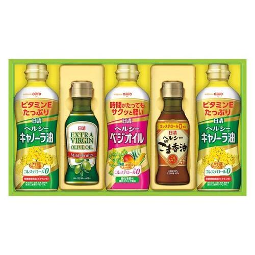- 日清ヘルシーキャノーラ油350g×2、日清ヘルシーベジオイル350g×1、日清エキストラバージンオリーブオイル145g×1、日清ヘルシーごま香油145g×1